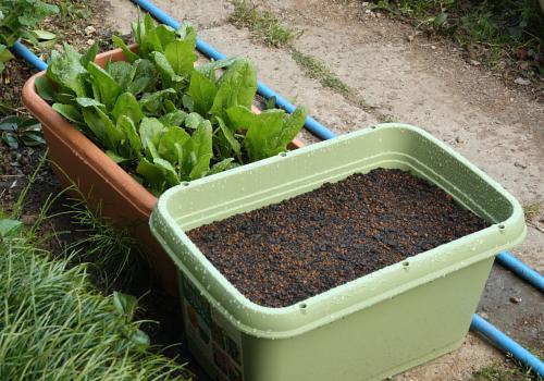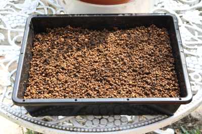 まずは「育苗箱」というのに用土を入れて水に浸してから種を撒き、さらに水で浸した用土を被せておきました。